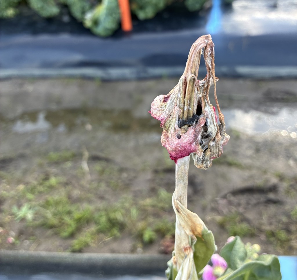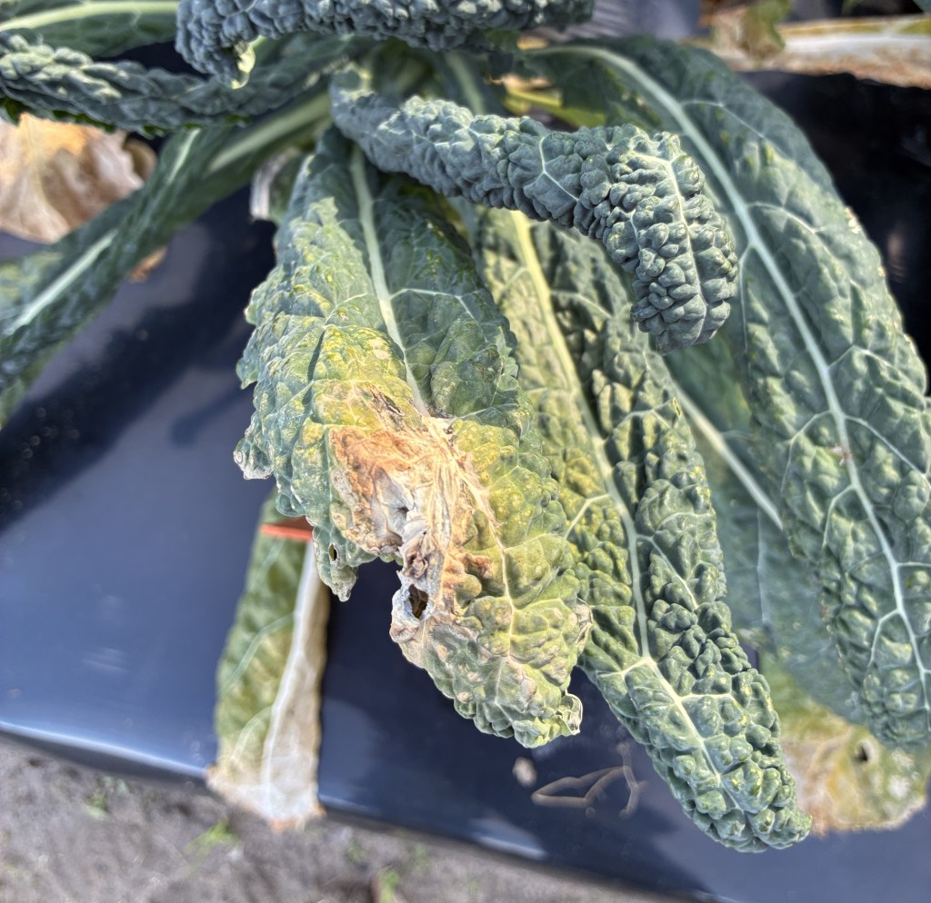 Organic growers can apply Contans, but this biopesticide is best used at transplanting and applied to soil, as it takes some time for the beneficial fungus active ingredient to kill sclerotia of the white mold fungus. As a reminder, Brassica oleracea crops are the brassica vegetables most susceptible to white mold. The list includes collard, kale, broccoli, cabbage, Brussels sprouts, kohlrabi, and cauliflower (if any is left in the field). Mustard and turnip greens (and probably turnip roots and rutabaga) are less susceptible and do not necessarily need to be sprayed.