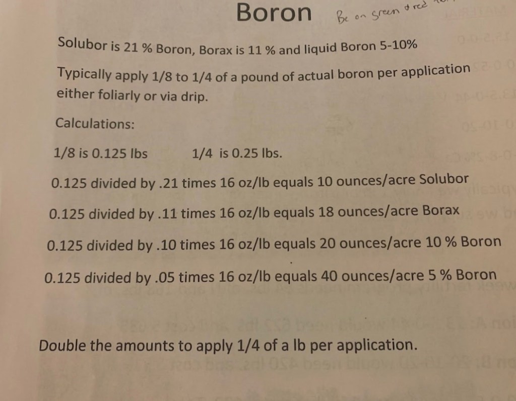 - Do not forget your boron applications (1/8 lb of actual boron) or you will have “bull-nosed” berries in 35 days.