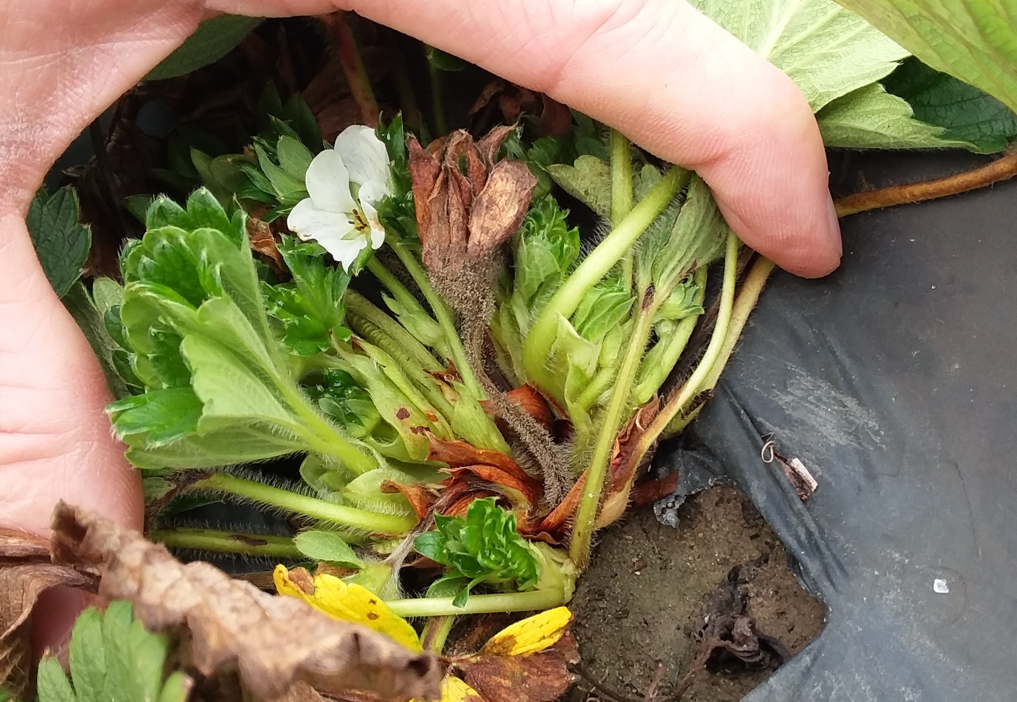 This this fuzzy-looking growth is grey mold caused by Botrytis cinerea. Grey mold is one of our most serious fruit rot diseases of strawberries that we see every single year in every single field. In addition to developing on fruit, grey mold can develop on dead or dying leaves, stems, and flower buds. This photo is a reminder that even though flowering and fruiting has not started quite yet, cold damaged tissue can become infected and serve as a source of fungal inoculum. The best ways to stay ahead of grey mold is to remove dead and dying tissue, including fruit, flowers, and leaves, and to maintain a good fungicide program once flowering/fruiting begins. Captan and thiram should make up the foundation of spray programs with site-specific fungicides (like Switch, Elevate, Fontelis, etc.) being added to the rotation prior to rain events. Download the MyIPM app to easily view recommended fungicides and their rates for grey mold and other strawberry diseases.
