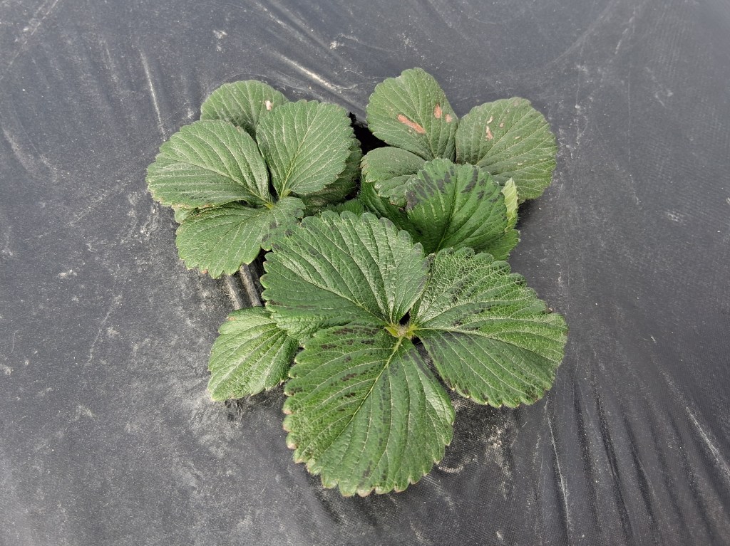 What caused the darkened (black-looking) patches on these strawberry leaves?