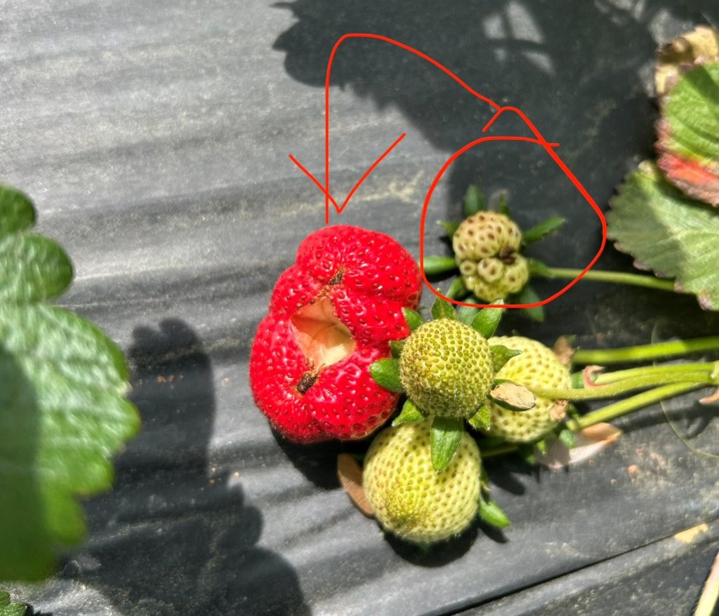- Many strawberry growers are also seeing damage to their fruit, often referred to as crab claw. In this case, the tips of the green fruit were damaged weeks earlier by cold or lack of pollination. As the fruit matures, a cavity forms, separating the berry. Boron deficiency can cause similar symptoms, but it was ruled out on this farm. This is common on the variety Camarosa, but in this case was in Fronteras and Surfline.