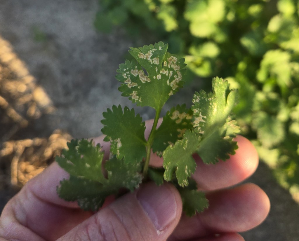 - Monitor herbs for signs of bacterial leaf blight. The picture is of cilantro exhibiting abiotic damage from cold temperatures, not bacterial blight. Bacterial blight typically has an oily, water-soaked appearance of the lesion and will not be isolated within the plant or uniform across the field.