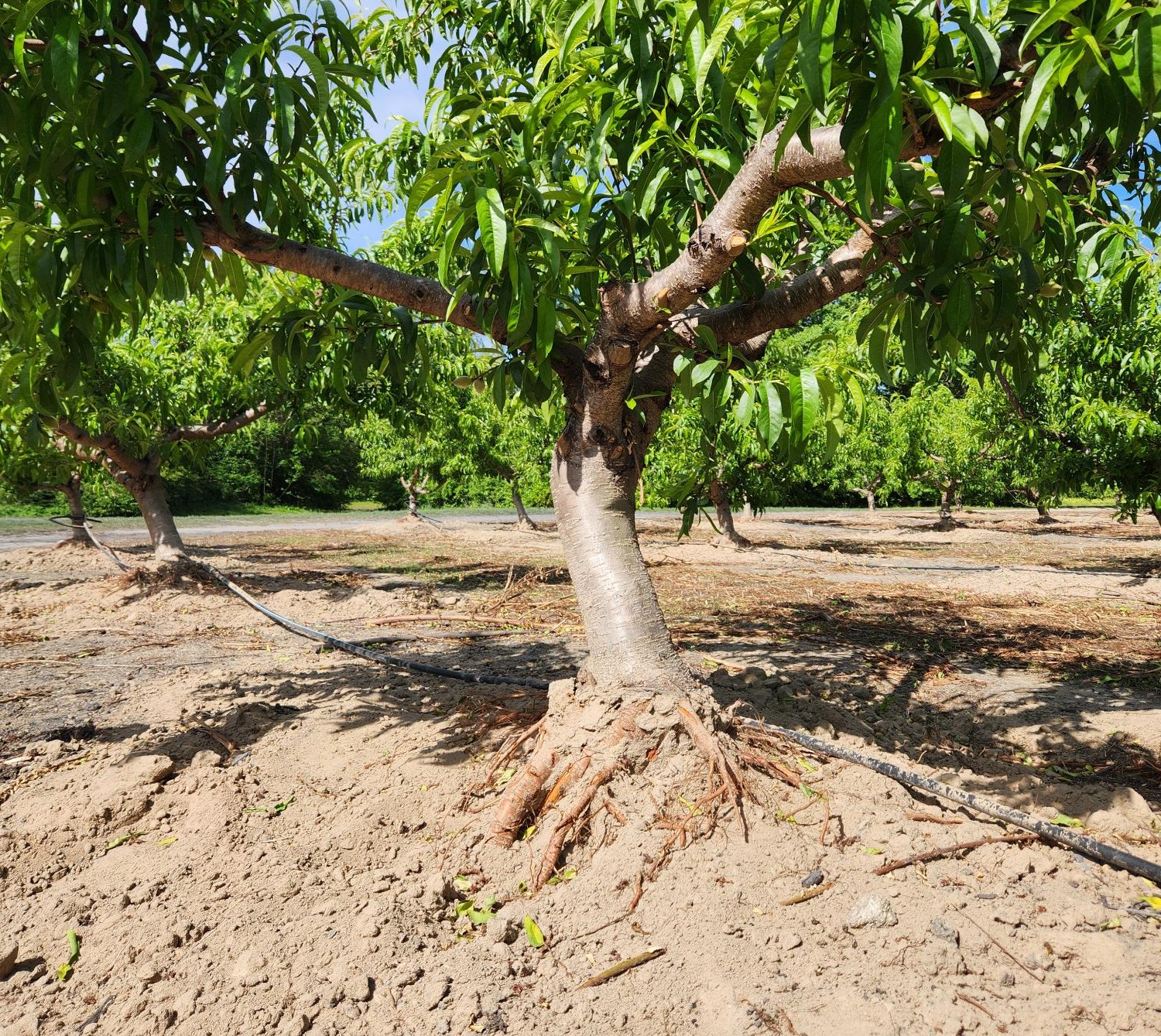Back to the root collar excavation… Once trees are established (and before laying irrigation) growers go through and remove the soil from the primary roots which exposes them to light and air (solar heating). This practice has proven to slow the growth and colonization of the fungus, which extends the life of a peach tree by several years.