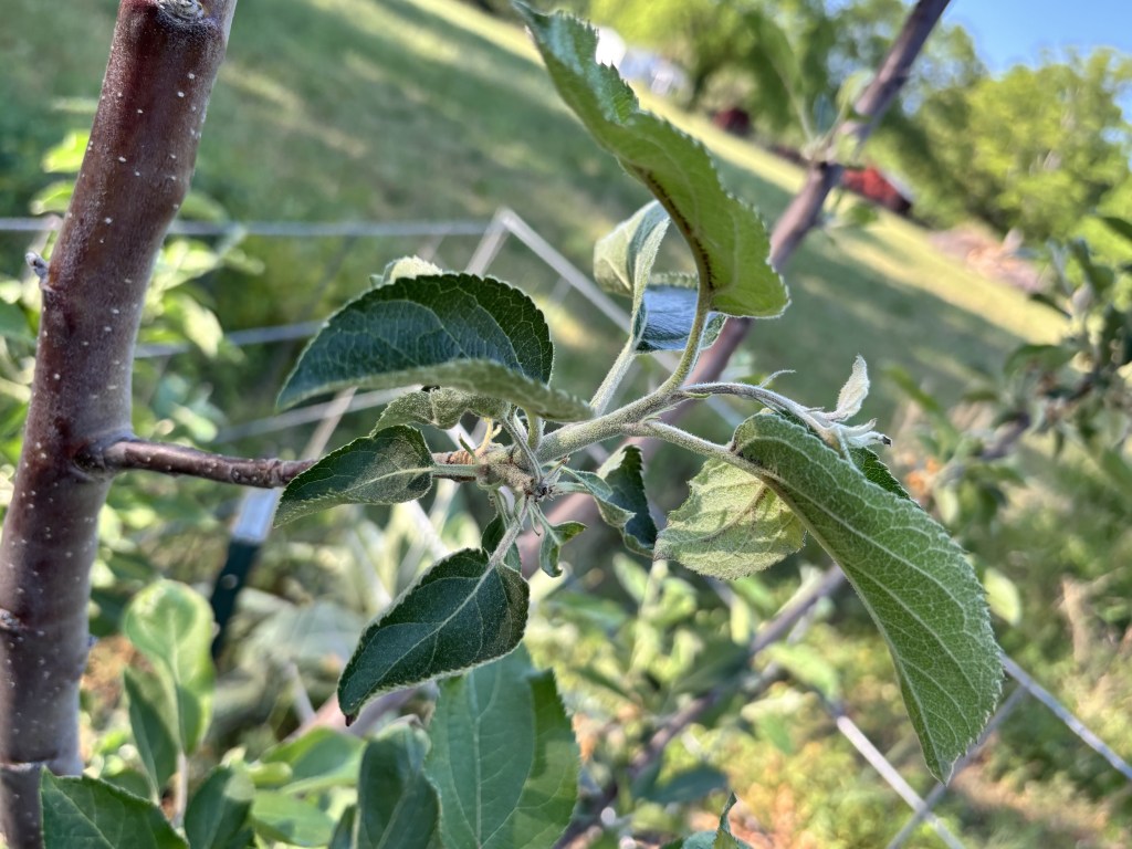 This picture shows very early symptoms of fire blight disease on a young apple shoot. Fire blight, caused by the bacterium Erwinia amylovora, is a disease that affects apple trees and can move quickly through young, tender growth. Early on—like in the shoot shown here—the first signs are subtle: the tip of a new shoot begins to wilt, and the youngest leaves may look slightly dull, water-soaked, or discolored. Blackening of the leaf tissues at the base and along the midribs is a common early symptom.